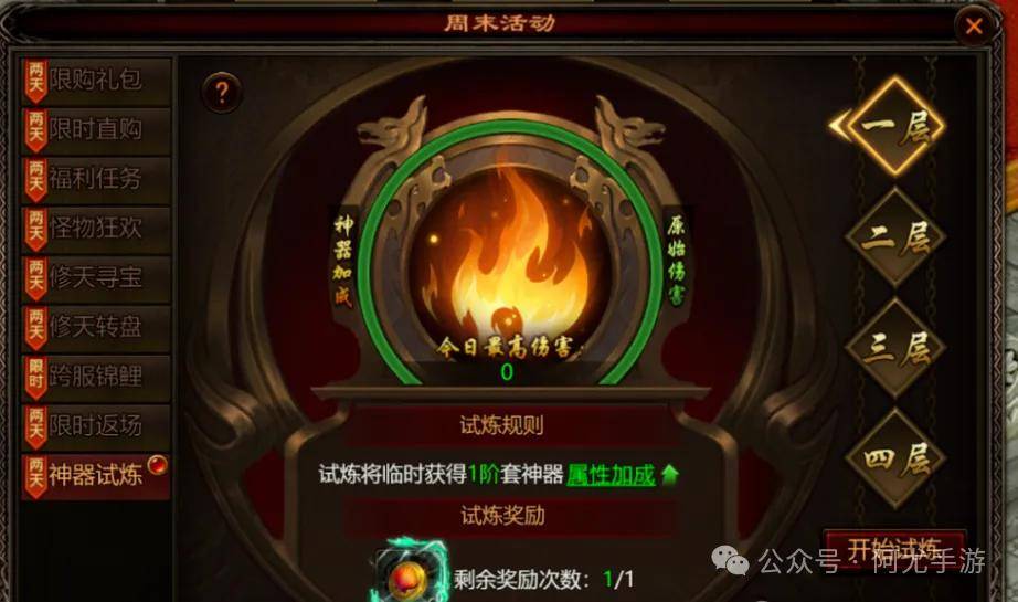 试炼开始后可进入副本挑战首领,挑战中会获得一整套神器属性加成,属性仅副本生效,仅供体验。