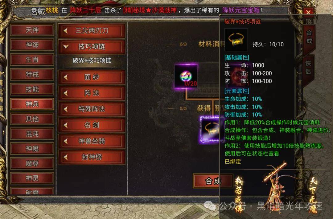 合成一条基础技巧项链,需要20个至尊宝石+1个万能合成石。
