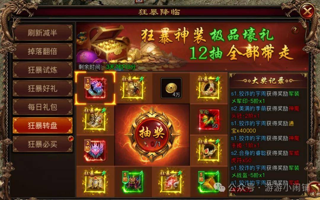 狂暴转盘总共有12件奖励,每次抽奖奖励不会重复,抽奖券的消耗会逐次递增,具体次数为:1/3/5/7/12/20/35/50/70/100/130/150。