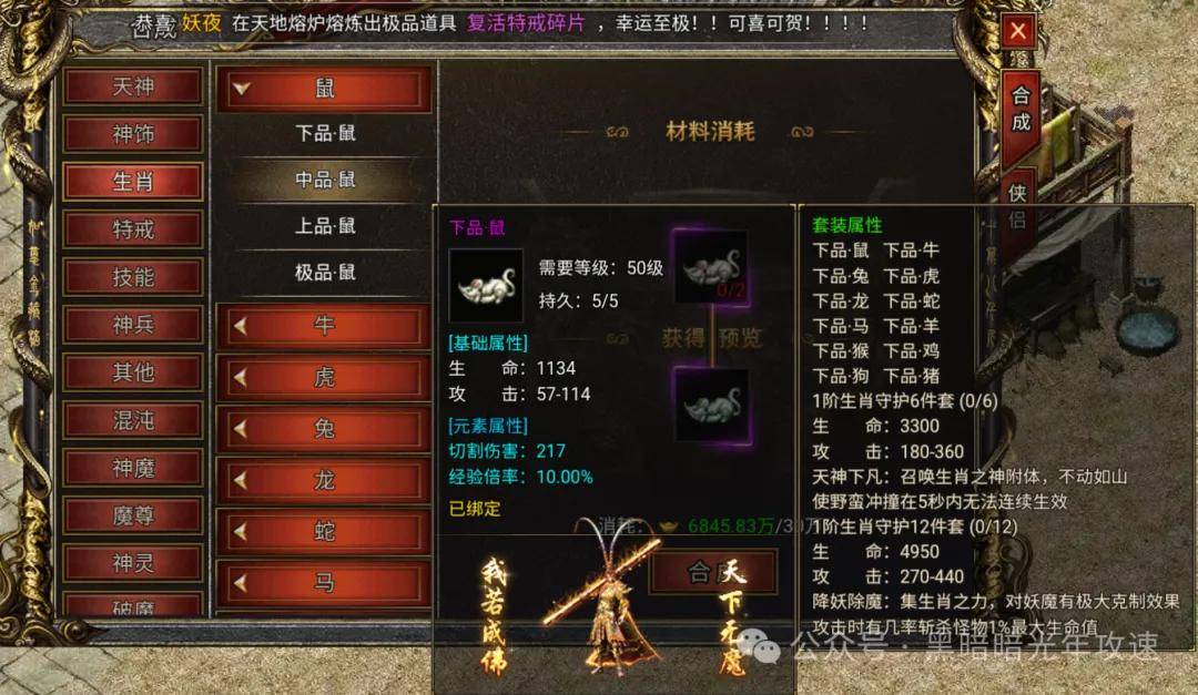 搞齐一套仙品生肖套作为基底。集中所有资源,把 牛、龙、蛇、猴、鸡这五个核心生肖,一口气冲到“圣5满级”。生肖系统的重点就从“升阶”转向了 “兽魂” 的升级和培养。