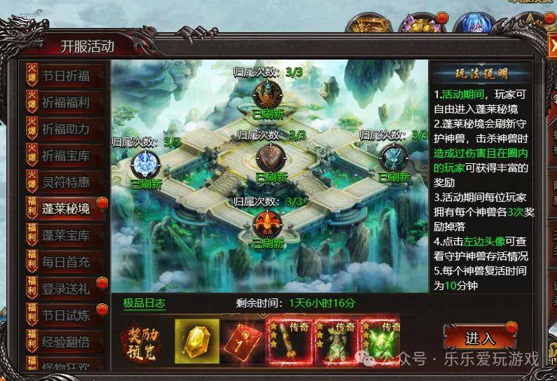2.蓬莱秘境会刷新守护神兽,击杀神兽时造成过伤害且在圈内的玩家可获得丰富的奖励