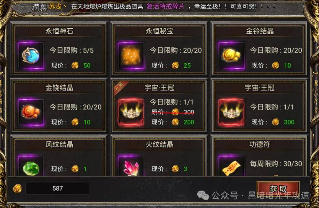 “永恒秘宝” 是去第三大陆的“西游秘境”,用降妖币兑换。25个降妖币换1个,每天限兑20个。那有没有办法获取更多?有,而且不少老鸟都在用。虽然永恒秘宝标注“可绑定”,但大号完全可以在拍卖行里直接购买。这里的门道在于,如果你有足够多的小号,让它们每天去兑换那20个绑定秘宝,然后通过某种方式(比如合成特定可交易物品)转移给大号,你每天的实际获取量就完全不受20个的限制了