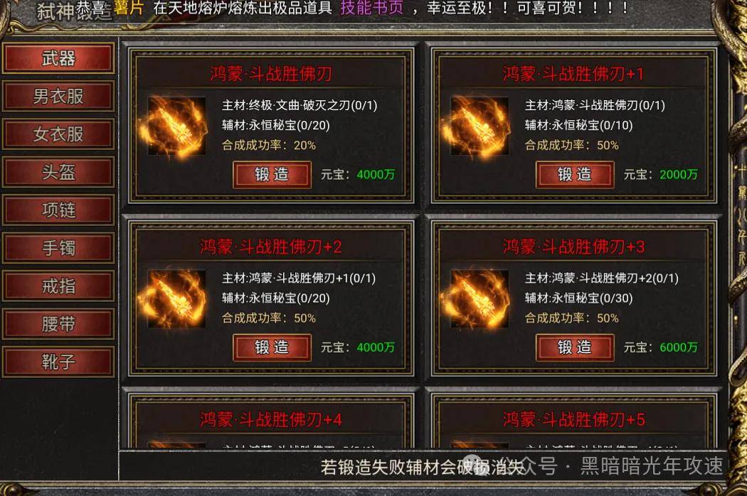 可消耗21转或以上的装备本身、永恒秘宝、以及大量元宝作为材料进行装备弑神锻造。弑神锻造成功率只有20%或50%。