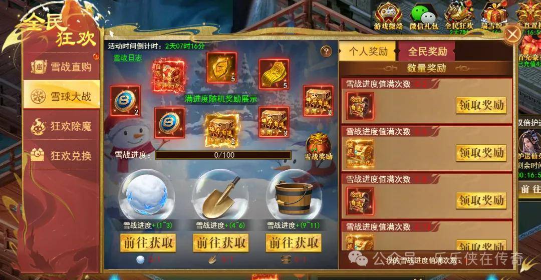 1.活动期间可通过狂欢除魔任务获得雪球,雪战直购获得铲子、小桶(3个道具均可得到狂欢币