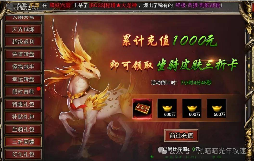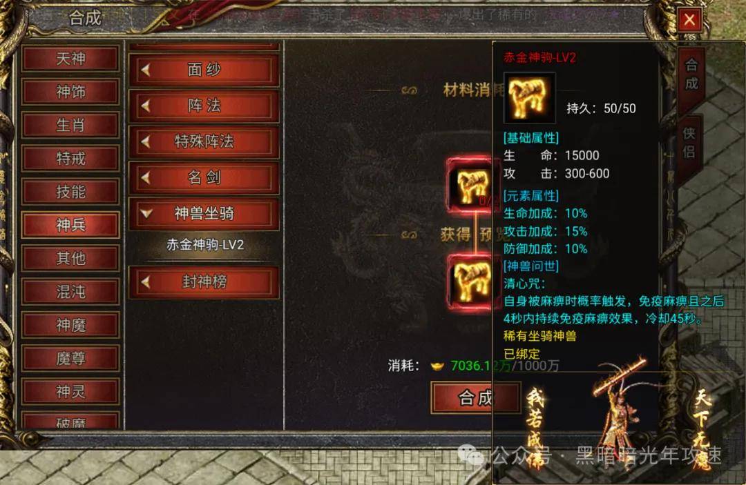 初始的LV1赤金神驹,通常需要通过游戏内的 “运营活动” 获取,算是比较稀有的奖励。想让它升级变强?路子只有一个:去合成系统,把两个完全相同的坐骑神兽,加上一大笔元宝.