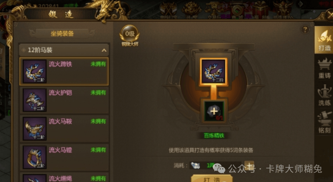 马装系统为坐骑提供了额外的装备选择,从而增强坐骑的属性和功能。马装系统包括打造、重铸、洗练和铭刻四种玩法。