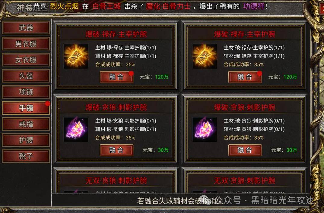 这就引出了第一个核心技巧:凡是带“吸血”属性的武器和项链,务必当主材! 因为这俩玩意儿爆率低得令人发指,一旦当辅材合成失败,肠子都能悔青。玉佩也带吸血,但它不参与这个合成体系,得去“神饰合成”里单独升。