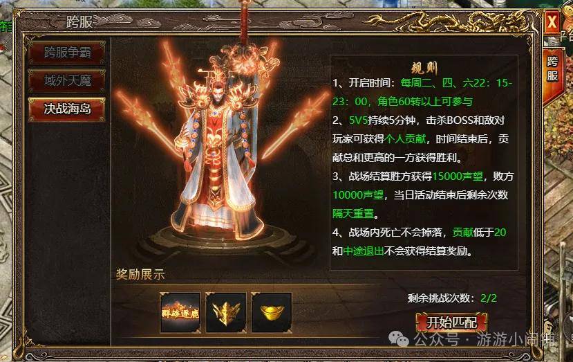上古战歌折扣渠道赏金传奇决战海岛开启时间:每周二、四、六22:15-23:00,角色60转以上可参与,5V5持续5分钟,击杀BOSS和敌对玩家可获得个人贡献,时间结束后,贡献总和更高的一方获得胜利。战场结算胜方获得15000声望,败方10000声望,当日活动结束后剩余次数隔天重置。战场内死亡不会掉落,贡献低于20和中途退出不会获得结算奖励。