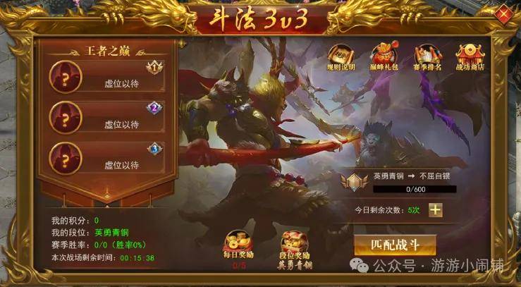 破天传奇折扣包服山海经之名剑录异兽传奇开服第7天开放斗法3v3活动,8转及以上玩家可参与,每天14:30-15:30和19:30-20:00开启比赛。开启后玩家可获得5次匹配次数,每天0点增加次数,最高只能累计10次,每周一赛季开启时重置清零上赛季次数,可消耗挑战券增加挑战次数,挑战券可在每日竞技礼包中获取。