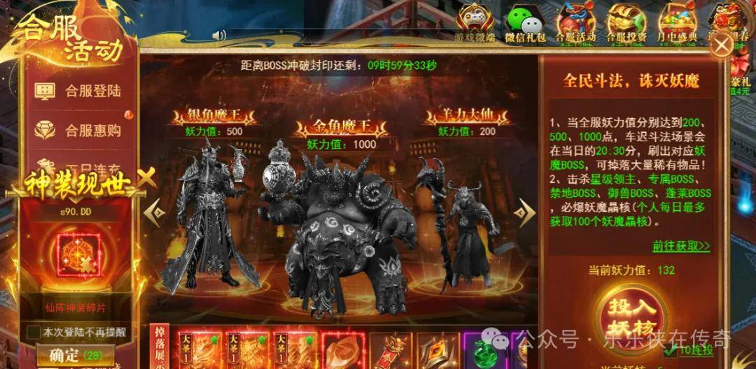 开天西游重回西游折扣包服当全服妖力值分别达到200、500、1000点,车迟斗法场景会在当日的20:30分,刷出对应妖魔B0SS,可掉落大量稀有物品!击杀星级领主、专属B0SS、禁地B0SS、御兽BOSS、蓬莱B0SS,必爆妖魔晶核(个人每日最多获取100个妖魔晶核)。
