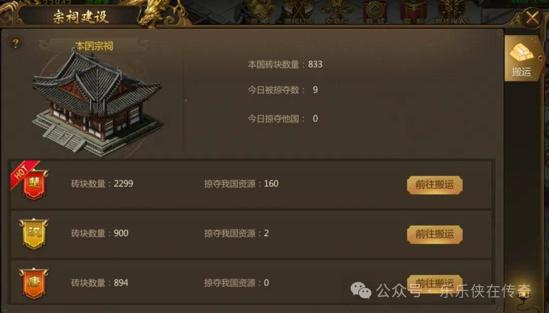 王者纪元下载九州王朝折扣渠道龙途天下本国王城宗祠处可接取任务,前往敌国宗祠获取砖块。可以在敌国宗祠处等待一段时间更换砖块以获取更高品质颜色。完成任务可获得经验、功勋等级奖励,砖块品质颜色越高奖励越丰厚。宗祠建设每日前3次有丰厚奖励,战事蔓延至8国后,目标国家将扩展到多国。弱国国民前往搬砖,宗祠处搬砖CD将会缩短一半。前往HOT国搬砖将会获得1.5经验。