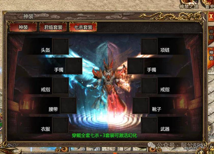 七杀套装不仅在属性上强大,其外观设计也极具特色。套装整体以暗红色为主,搭配金色的装饰,显得既神秘又霸气。当玩家穿上七杀套装时,还会触发特殊的外观特效,如火焰环绕、闪电闪烁等,使玩家在人群中更加显眼。