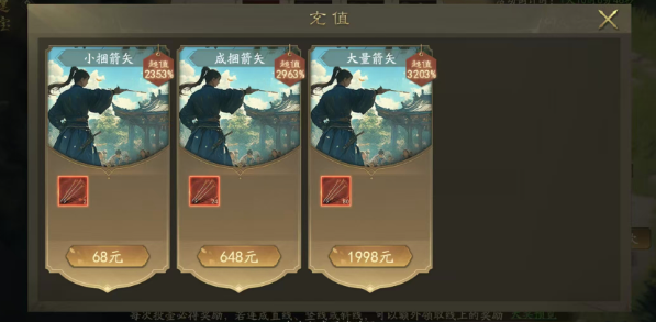 点击左下角充值购买箭矢,三个档位里1998档位超值3203%,远超其他两档。这是整个活动的设计核心——要么不氪,要么直接1998,68和648档位都是"吃亏选项"。