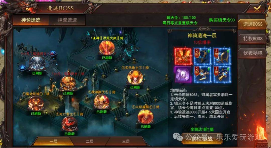 镇天令,是挑战神骑遗迹BOSS的绝对硬通货。它的作用简单而残酷:只有消耗镇天令,你才能对遗迹BOSS造成有效伤害。 这并非简单的门票,更是衡量你输出资格的唯一标尺。系统每日会在零点为你重置100点镇天令,这100点,就是你当天挑战BOSS的全部“弹药”。