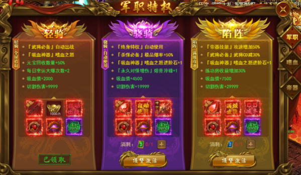 轻骑之上的军职档位,核心奖励变为【嗜血升阶石】,用于提升嗜血之怒的星级。星级越高,属性加成越夸张。建议有能力就逐级解锁,把嗜血之怒堆到高星,这是贯穿前中后期的核心装备。
