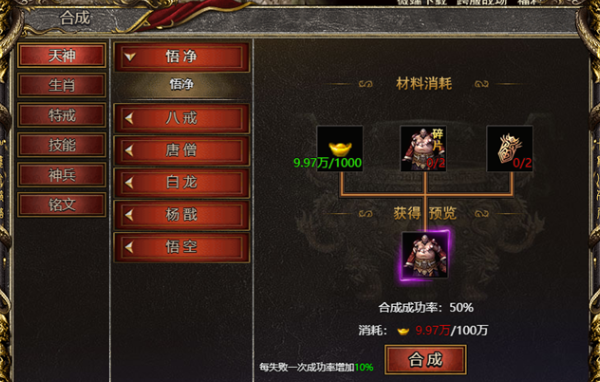 天神装备共6部位:悟净、八戒、唐僧、白龍、杨戬、悟空,属性分两类。悟净、唐僧、杨戬主切割伤害,唐僧杨戬额外加生命防御百分比;八戒、白龍、悟空主受怪减伤,白龍悟空额外加生命防御数值。合成需对应天神碎片+封神令+大量元宝,材料日常积累,高阶封神令稀缺。