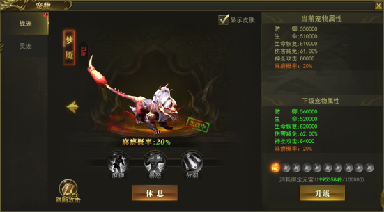 宠物系统升级全部靠元宝就可以了,是一个非常良心的系统。宠物能够对抗一切BOSS