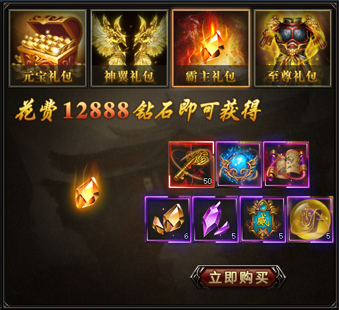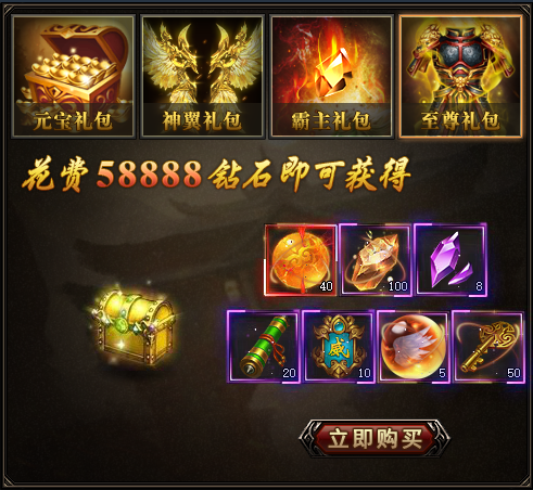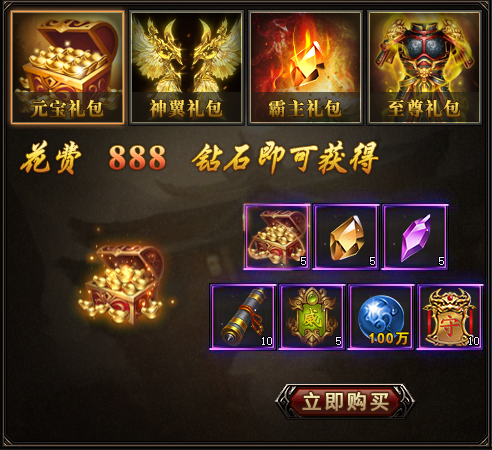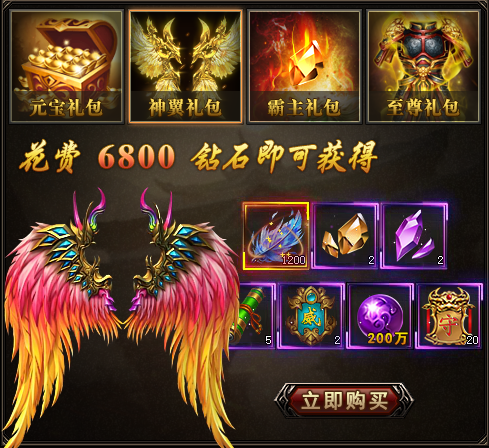 特惠礼包页签包括元宝礼包、神翼礼包、霸主礼包、至尊礼包。
