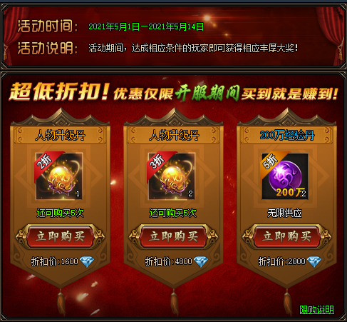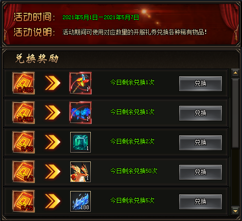 开服前七日,玩家通过开服限购活动获得开服礼券,使用相应数量的开服庆典礼券换取对应道具奖励。