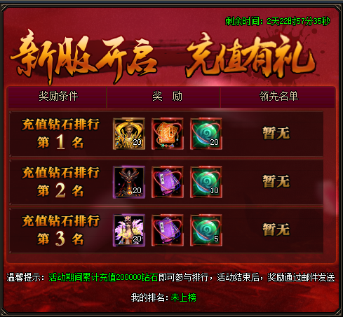 开服前三日充值排名前三名能够获得豪华奖励。