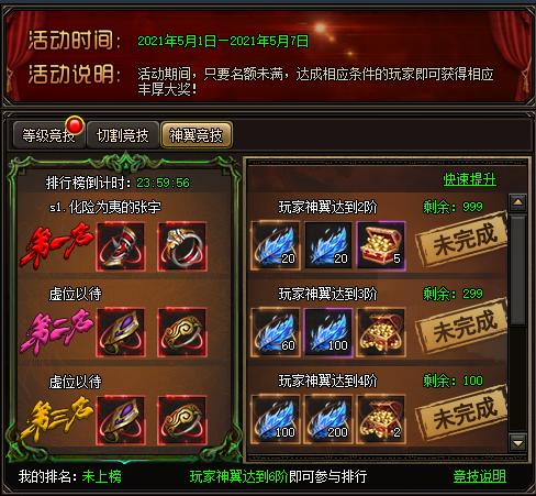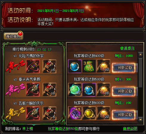 第二名为炼狱飞龙碎片*20、威压*1、伙伴升级突破丹*10。