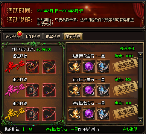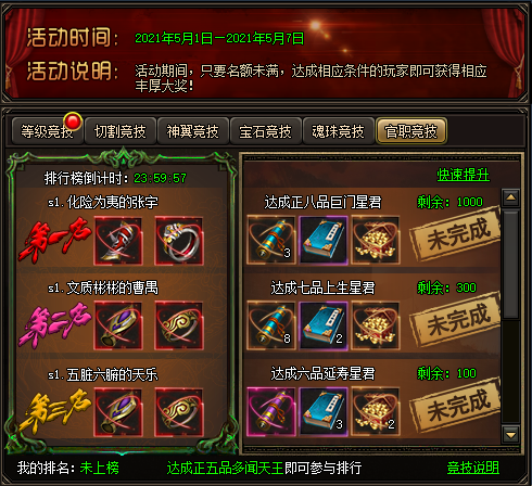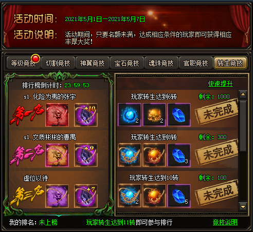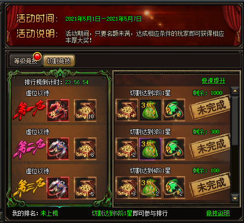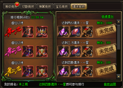 开服竞技包括:等级竞技、切割竞技、神翼竞技、宝石竞技、魂珠竞技、官职竞技、转生竞技。按照顺序从开服第一天开始,每个竞技持续一天时间,当天的24点结算排名奖励。对应的等级礼包的领取有数量限制,先到先得。
