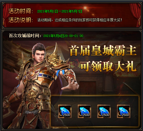 开服第四天晚上8-9点开启的首次攻占皇城的公会会长可获得大量钻石奖励。