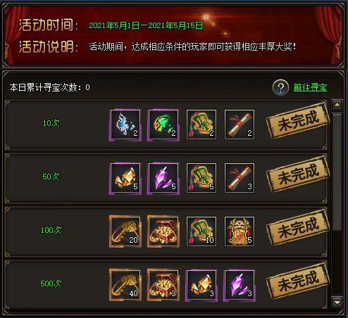 活动期间,每天寻宝达到相应的次数即可领取丰厚奖励!