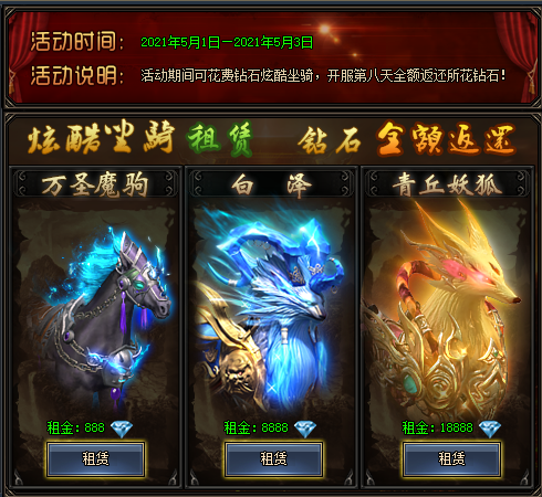 开服前三日,玩家可花费元宝购买一只或多只带有属性的炫酷坐骑,花费的元宝会在开服第八日通过邮件全额返还。