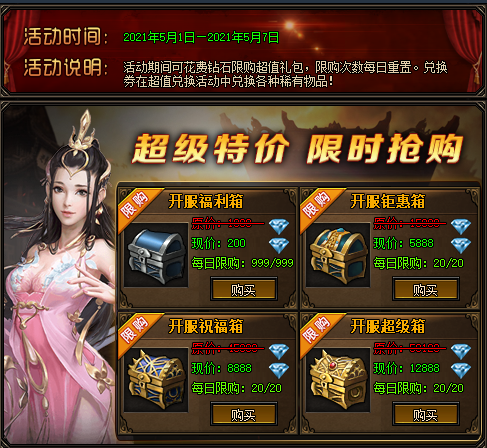开服前七日,玩家每日花费钻石购买开服福利箱、开服钜惠箱、开服祝福箱及开服超级箱。开启后可获得大量开服礼券及相应稀有道具一件。