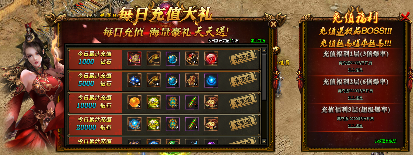 每日充值元宝数达到相应金额即可领取对应奖励。充值达到规定的