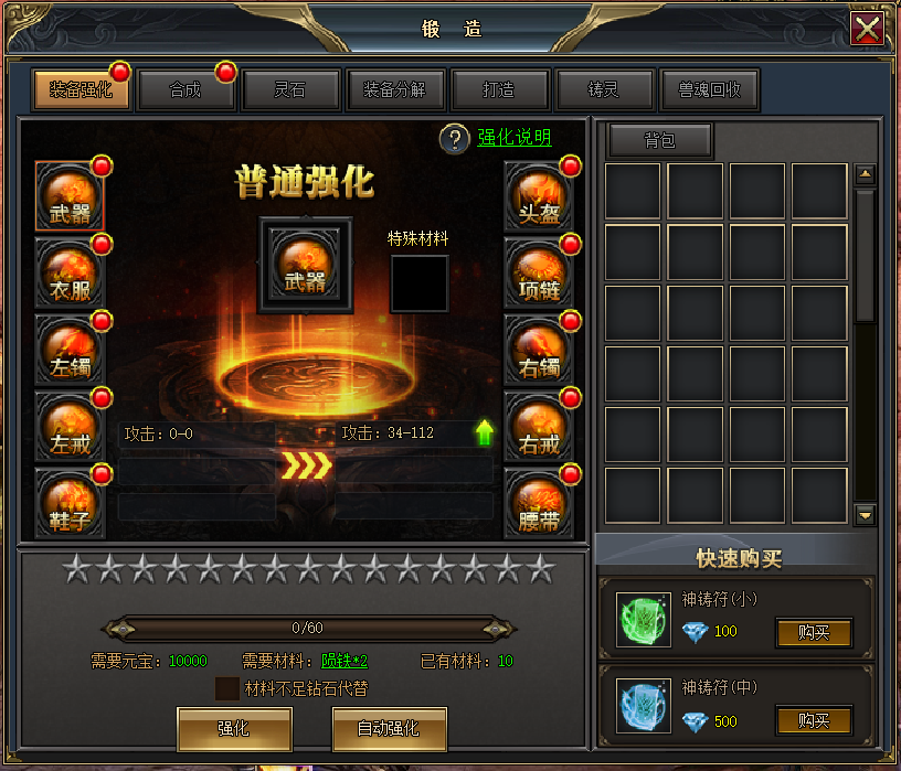 可通过黑铁矿来强化装备,装备强化等级越高,属性越高。