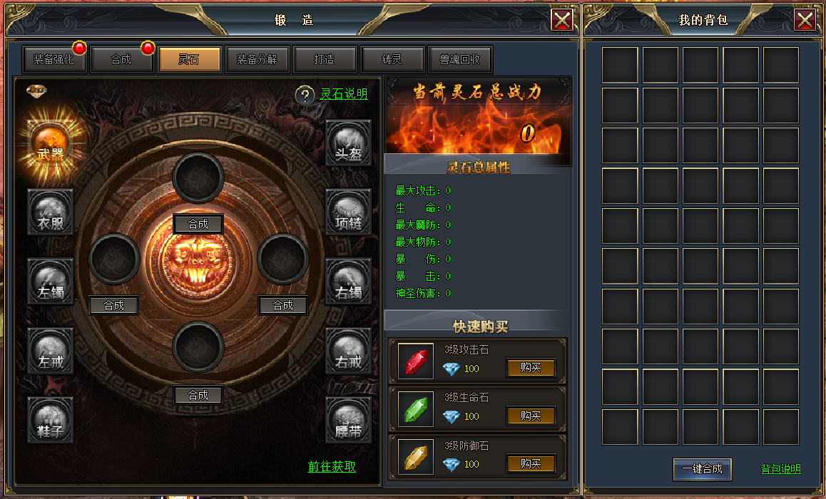 1.通过3合1合成提升灵石等级,灵石等级越高,属性越高,更有套装属性加成