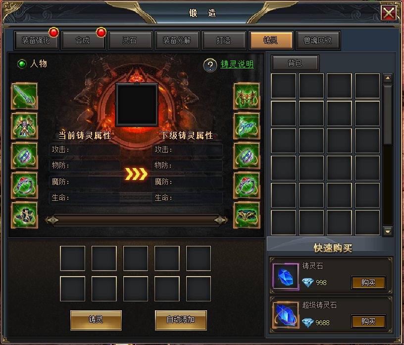 可用多余的转生装备进行铸灵,铸灵只铸灵装备位,替换装备,铸灵等级不变