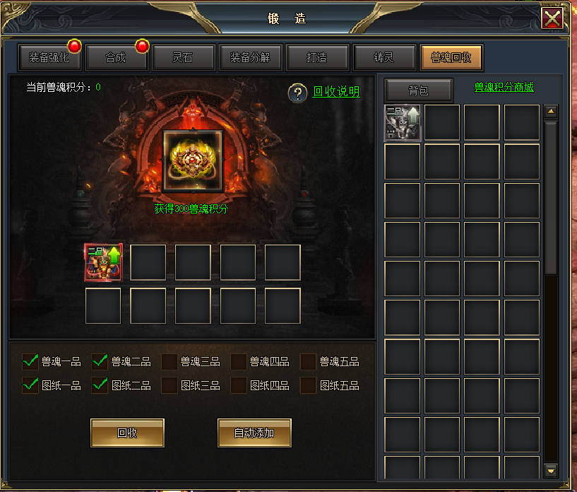 多余的兽魂图纸和兽魂装备可在兽魂回收界面回收为兽魂积分,积分可在积分商城购买更高阶的兽魂相关的道具