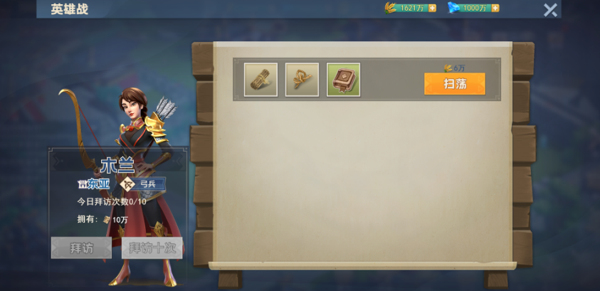右侧关卡是一系列线性关卡,各个城池的英雄战关卡数量不尽相同。在列表项的左侧是挑战胜利后的奖励,左侧为挑战按钮和挑战消耗的粮草。当玩家挑战胜利后,挑战按钮会转变为扫荡按钮,点击扫荡按钮可打开扫荡界面。
