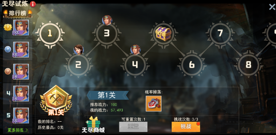 玩家达到44级可以参与无尽试炼挑战。每次挑战都会获得奖励,挑战一定关卡后还可以额外获得宝箱。玩家挑战成功不会扣除挑战次数,挑战失败则挑战次数-1,玩家每日挑战次数用完后可以购买,购买价格随着当日购买次数增加而逐渐增加,次日重置。