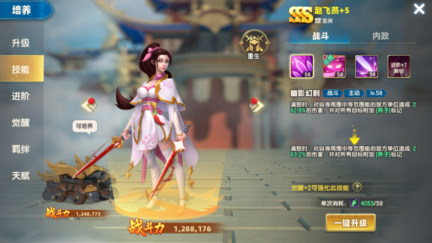 英雄技能共分为战斗技能和内政技能。战斗技能同英雄等级一样,具备可成长性,玩家可通过消耗技能石进行升级,战斗技能等级上限取决于英雄当前等级;内政技能不可升级,在英雄进阶+4、+6、+8、+11时解锁开放。