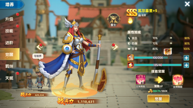 点击主界面右下角“英雄”按钮进入英雄页面,英雄达到一定等级可以激活侍卫,英雄将携带侍卫一起进入战斗,英雄培养是游戏中很重要的一条成长线。