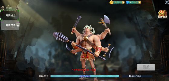 玩家30级开启兵种副本,点击中间的英雄形象会获得一定产出,每次点击都会消耗剩余次数,剩余次数随时间不断恢复,最高可以累加到50次,注意这里的剩余次数不会每日重置。当进度条被点完以后,即可挑战该英雄,挑战胜利后可以进入下一个兵种副本。