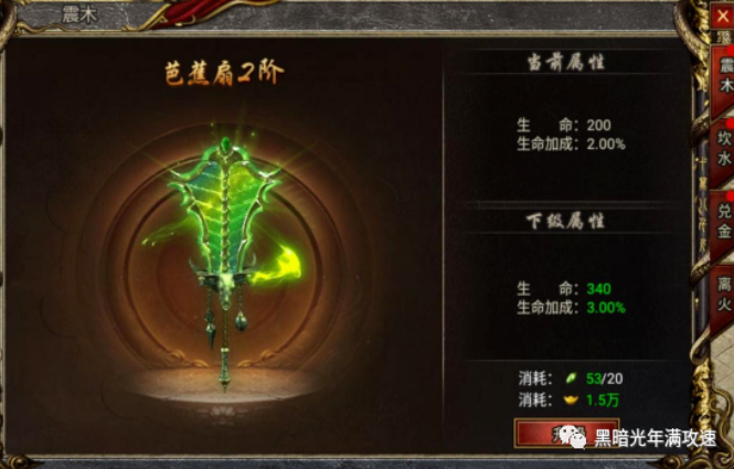 震木可提升生命;坎水可提升防御;兑金提升攻击;离火提升暴击等四种属性。震木和坎水满级50阶,兑金和离火满阶30阶。