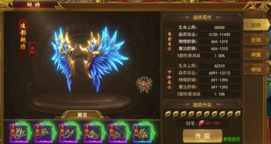 1、可通过翅膀丹升级翅膀,提升等级有更多属性加成