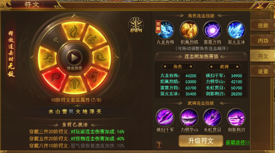 1、镶嵌符文可提升角色、武将的基础属性和连击技能附加伤害值