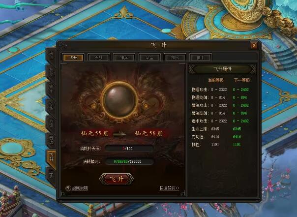 开服60天的时候开启飞升系统,我们需要消耗补天石和精元提升等级。飞升等级一共有80级,我们前期的话升级到20级就不着急了。首先精元我们每天可以用经验兑换,可以直接免费兑换即可,如果想提升的快一些可以用元宝多倍兑换。