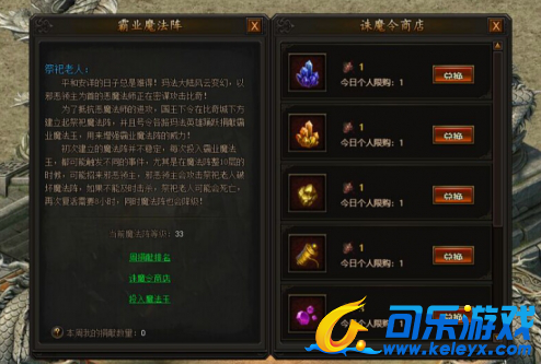 最后要说一点,伴随这个玩法出现了诛魔令商店,这个商店主要是用诛魔令兑换相关游戏道具。诛魔令是在每次捐献魔法玉后,有几率获得诛魔令。不过诛魔商店里的部分可兑换道具有每天个人限购次数和每周全服限购次数限制。