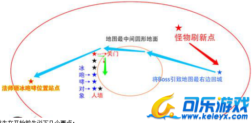 8.当怪物卡在人墙上法师冰咆哮砸上后就是关门了,记得用人墙最上的角色或是引怪的肉盾去关门;关门注意的是当怪物行走路线下走的时候在一步步关门,不要直接下去关门把大Boss挤出去。