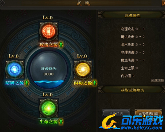 传奇霸业中,点击任务栏里面的人物一栏,会看到左边竖行有一个武魂系统,点击进入就会发现如上图的页面,玩家可以通过消耗修为来提升四项属性,根据玩家自己给自己判定来提升,中间显示的就是你现有的武魂修为,有绿色箭头表示玩家可以通过点击来提升武魂系统。