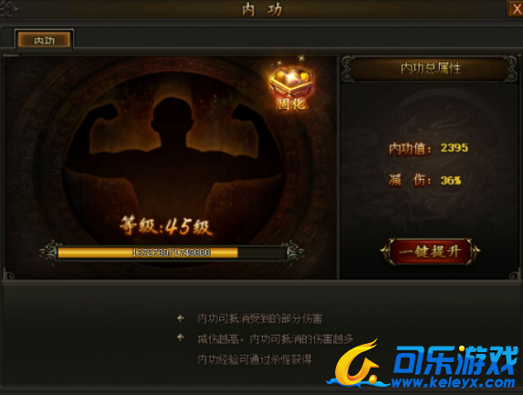内功想要提高减伤属性,就要进行升级,内功升级的经验,可以通过在游戏中杀怪来获得。当内功经验值达到升级要求之后,就可以对内功等级进行一键提升了。