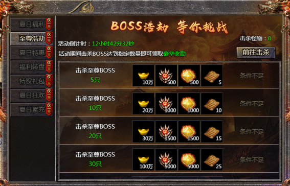 活动内容:活动期间击杀指定数量的怪物即可获得奖励。