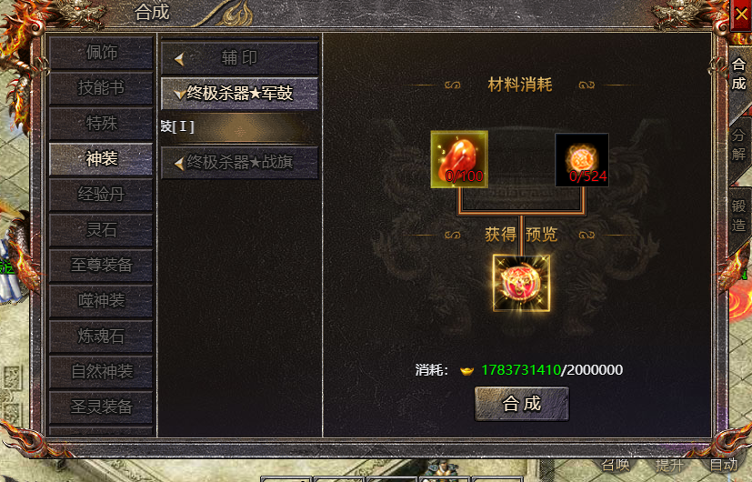 1、开服45天后,玩家可在合成中合成终极杀器★军鼓
